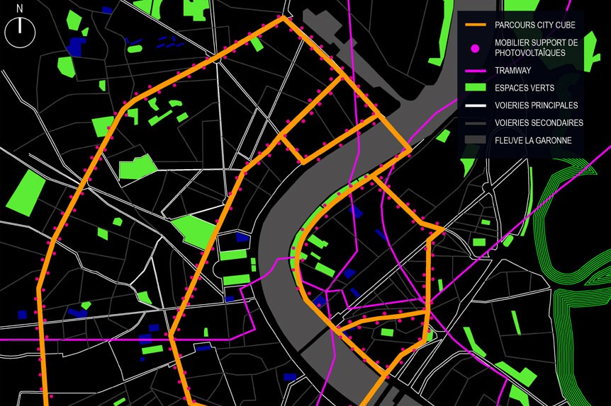 Le City Cube est un dispositif plurifonctionnel de mobilier implanté sur toute la ville au long de ses axes majeurs et permettant des activités variées et changeantes : une autre façon de vivre la ville et de la percevoir. Selon les auteurs de cette proposition « Vivre la ville, c’est l’habiter, y travailler, la traverser, la découvrir. Créer de la densité, c’est cadrer le paysage urbain, le mettre en scène, proposer une flexibilité spatiale et temporelle ». C’est pourquoi, ils proposent de « développer un « Tram habité ». Des rails, des espaces modulables, des fonctions et un parcours à travers Bordeaux. » C’est pour eux « un moyen simple, à échelle humaine, pour une densification en douceur de la ville en constitution. »