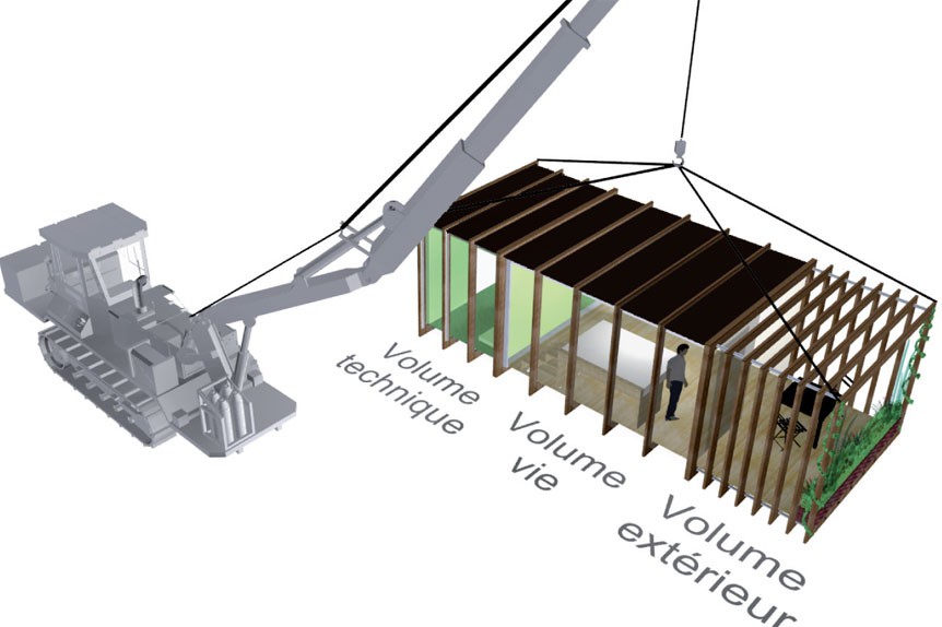 Afin de résorber le problème du manque de logements étudiants à Bordeaux, ce projet propose d’intégrer à travers la toiture un module préfabriqué. Ce module assez visible depuis l’espace public préserve seulement la première rangée de tuiles faîtières afin de conserver l’alignement des toitures. Il insiste aussi sur l’utilisation de matériaux écologiques, notamment le pin des Landes.
