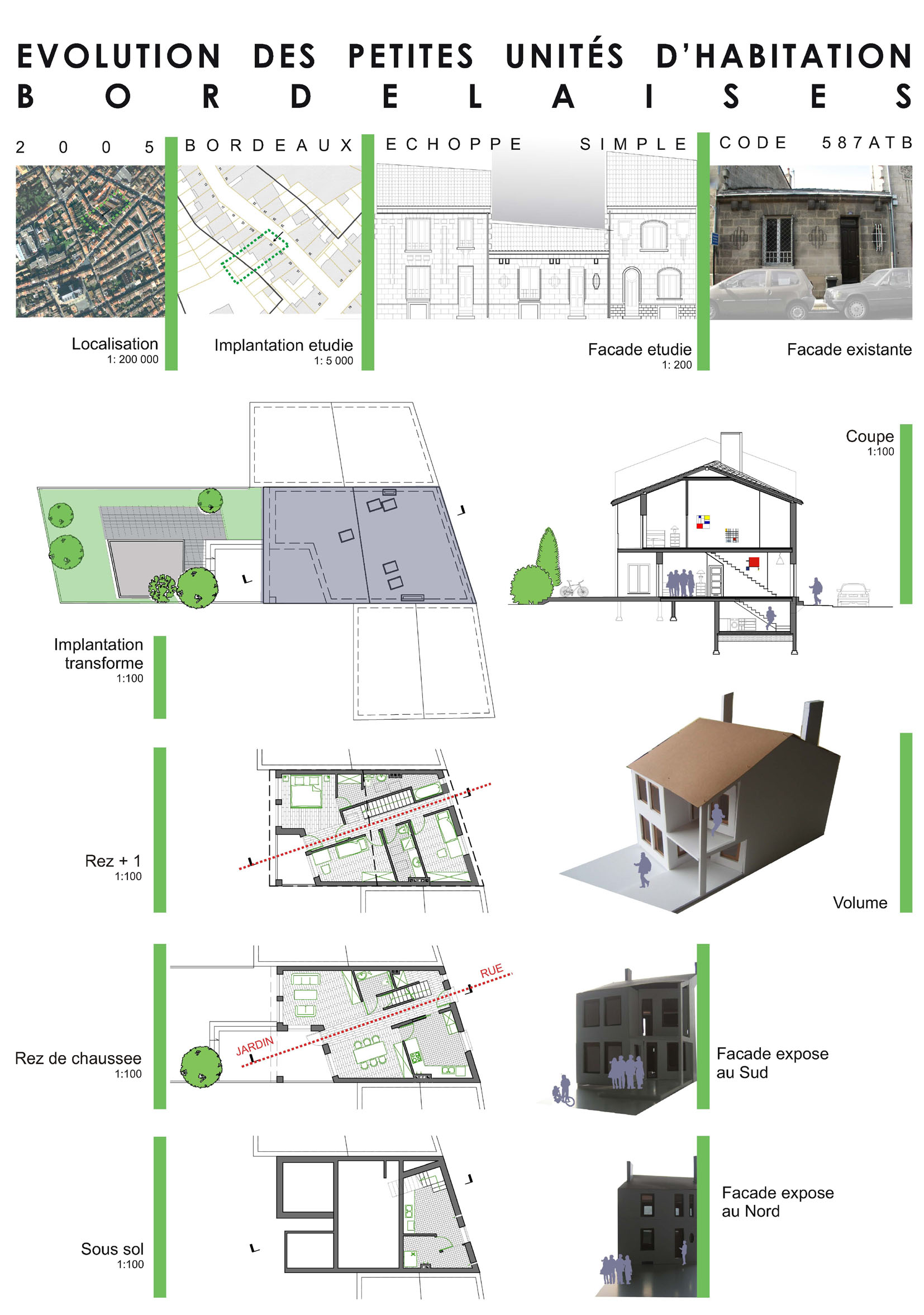 Ce projet propose d’augmenter les surfaces habitables en surélevant l’ensemble de la construction d’un niveau et en intégrant les constructions en appendice sur l’arrière. Il transforme l’échoppe en maison de ville en R+1. Les élévations présentent des percements réguliers reprenant le rythme des travées.