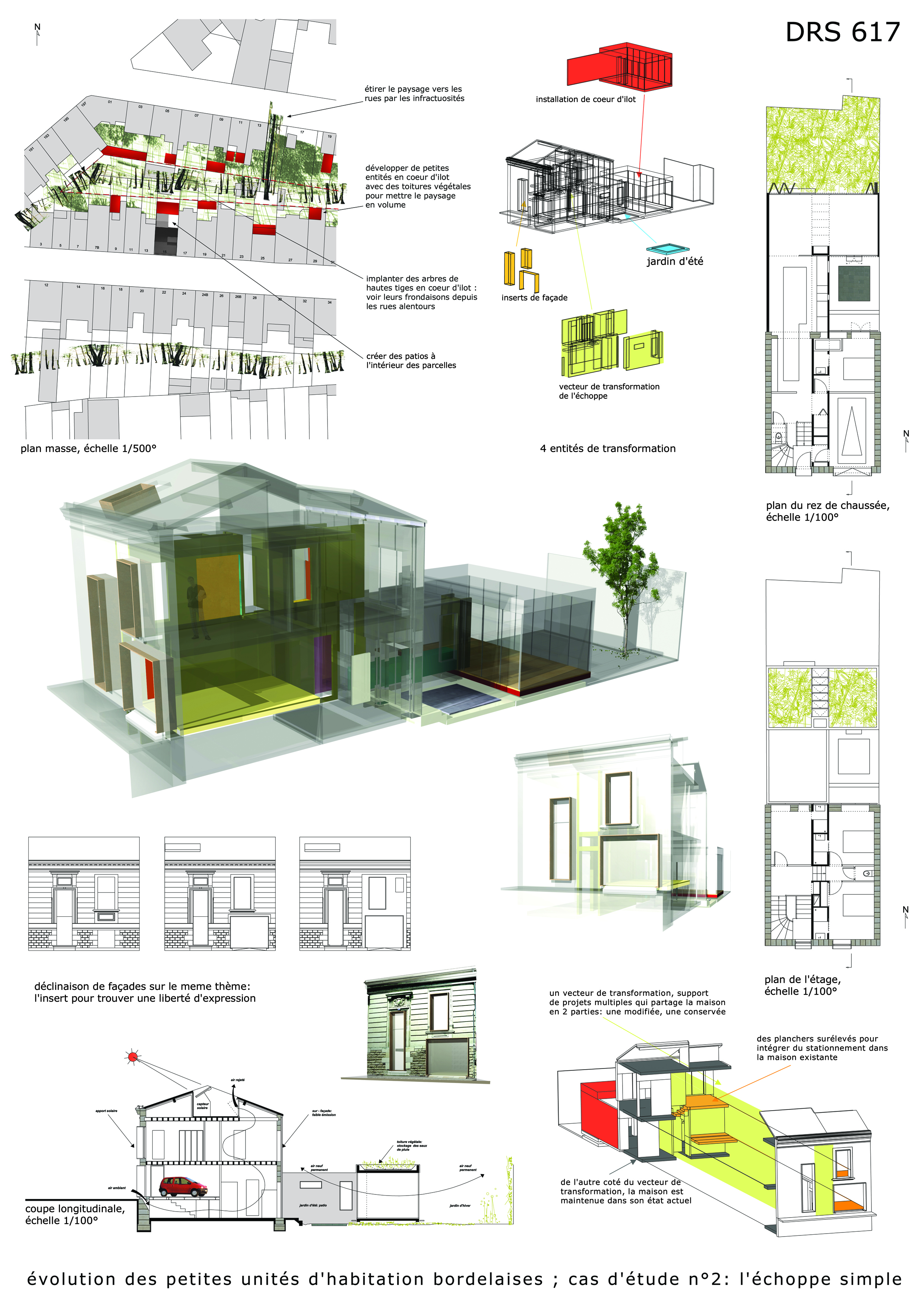 Ce projet tente l’insertion d’une place de stationnement à l’intérieur du volume bâti en modifiant le dessin de la façade. Afin de retrouver la surface alors occupée par la voiture, une extension d’un niveau à l’arrière se développe autour d’un patio aménagé en jardin intérieur. La toiture terrasse modifie le caractère du volume bâti et la nouvelle façade introduit une rupture dans l’ordonnancement des façades de la rue.